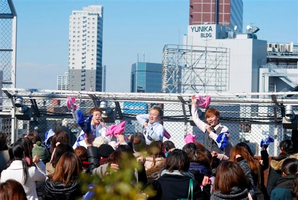 冷たく強い風が吹きつけたこの日の東京。しかし、空は真っ青な快晴。集まったファンとともに、3人は寒さに負けない熱いメッセージを歌い上げた。