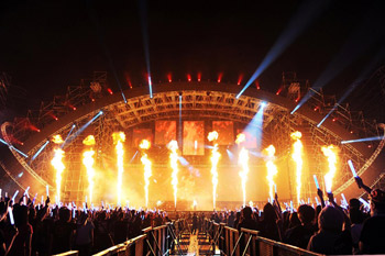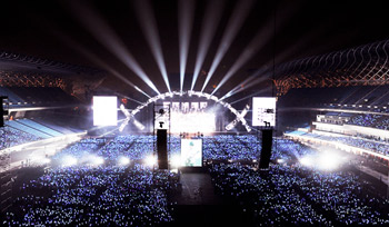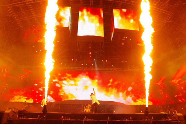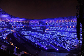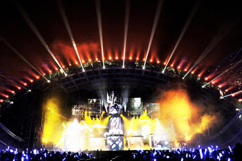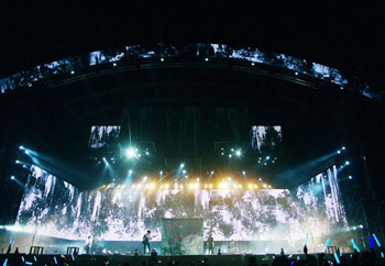 一気にノリのいいナンバーが続いた怒濤の後半は、クライマックスシーンの連続。方舟(航空母艦)に見立てた車の上で演奏しながらフィールド外周を廻るという一大パレードには、客席からの歓声が止むことがない。本編ラストとなった「離開地球表面+諾亞方舟」のエンディングでは、打ち上げ花火の連発、スモークの大量噴射、金の花吹雪が舞う大掛かりな演出で劇的に幕を閉じた。