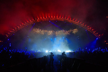 会場となった高雄世運主場館は、サッカーや陸上などの国際競技が開催される開放式競技場。日本でいえば、国立競技場や味の素スタジアムに匹敵する5万人の収容が可能な大型施設だ。幾重にもトラスが組まれたステージ上には虹のような巨大アーチが掛けられ、左右幅は100m以上あろうかというあまりにも壮大なもの。オープニングアクトである女性シンガー白安のステージを挟んで、いよいよMaydayがステージに登場する。