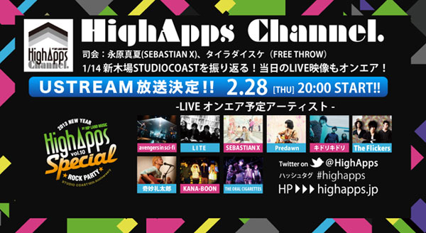また、1月14日に新木場STUDIO COASTで行なわれ、大盛況で終了した<HighApps Vol.10 SPECIAL!! ~2013 New Year Rock Party!~>の、特別Ustream番組の配信が決定した。