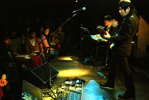 打ち込みベースでありながらも表情豊かで壮大なオーケストレーショントラックに、青柳の奏でる美しいピアノの旋律と繊細なソプラノサックスと、そして真鍋のエモーショナルかつ繊細に歌心感溢れるギターソロが会場内を包んで行く。所々でお互い身振り手振りで曲のアクセントを合わせる場面もありスリリングながら心地よい緊張感が素晴らしい。