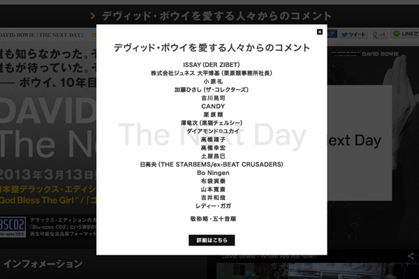 デヴィッド・ボウイの10年ぶりのニュー・アルバム『ザ・ネクスト・デイ』の3月13日発売を祝し、多くの著名人からの祝福メッセージが寄せられている。下記に紹介しよう。