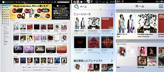 ▲「Music Unlimited」の画面。PCのブラウザ(画面左)では左のメニューでライブラリーや作成したプレイリストにすぐアクセス可能。ホーム画面にはニューリリースやチャンネルがリストアップされる。画面中はAndroid(TM)、右はiPhone 4の専用アプリ画面。デバイスにより画面構成は異なる。