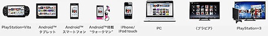 ▲パソコン、スマートフォンのほか、PlayStation 3(R)、PS Vita(R)、ブラビアなど多彩なデバイスに対応。ブラビアはプレイリストの作成/編集ができないといったデバイスの利用状況に合わせた機能の違いがある。詳細は対応製品・対応機種一覧リンクでチェックを。