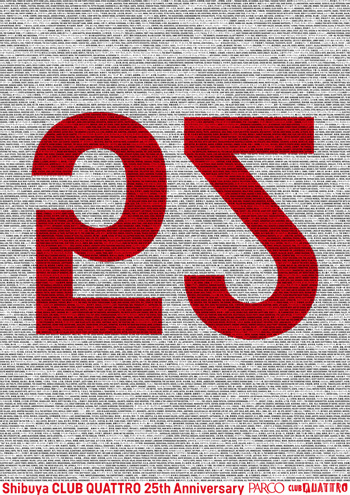 25周年のロゴデザインはデザイナーズ集団NO DESIGNによるもので、バックの黒い点のようなものは、全てアーティストの名前が書き連なっているものだ。渋谷クラブクアトロのこけら落としを飾ったポーランド出身のBASIA(バーシア)から、2013年3月に渋谷クラブクアトロをSOLD OUTさせた世界中で今最も注目を集めるカナダの女性シンガーGRIMES(グライムス)まで、出演者のヒストリーが刻まれており、その上に「革命」を表現した“25”が記されている。