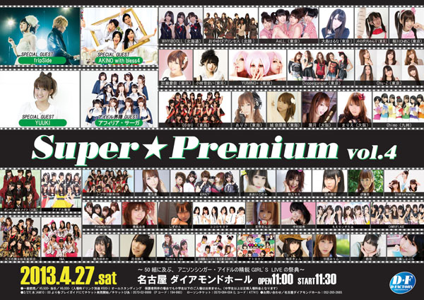2013年4月27日(土)に名古屋・ダイアモンドホールにてアニソンシンガー・アイドルのライブイベント<Super★Premium vol.4>が開催されることが決定した。スペシャルゲストにはアフィリア・サーガ、fripSide、AKINO with bless4、Sound Horizonのゲストボーカルとして有名なYUUKIを迎え、総勢50組のアーティストが参加する。