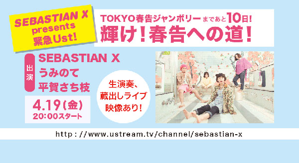 シングル「ヒバリオペラ」をリリースしたばかりのSEBASTIAN Xが、4月29日に行われる主催野外イベント<TOKYO春告ジャンボリー2013>開催に向けて、イベント開催10日前となる4月19日に緊急Ustream特別番組を放送する。