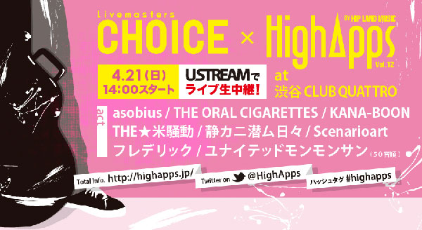 4月21日に渋谷CLUB QUATTROにて開催される<Livemasters CHOICE × HighApps>のUstreamでのライブ生中継が決定した。