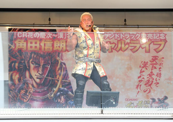タレント、俳優、歌手など幅広いジャンルで活躍中の人気格闘家・角田信朗が、ニュー・アルバム「戦国パチンコ『CR花の慶次~漢』オリジナルサウンドトラック」を4月24日に発売したのを記念して10日、東京・新橋のSL広場前「新橋ファロシティ」でスペシャルライヴを開催した。