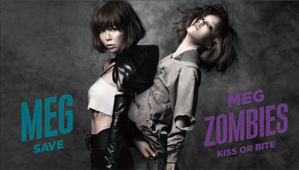 戦士をイメージしたビジュアルのMEG名義から「SAVE」、ゾンビをイメージしたビジュアルの MEG ZOMBIES名義から「KISS OR BITE」の、2枚のシングルを6月5日同時リリースするMEGが、両楽曲のMUSIC CLIPとジャケット写真を特設サイト「MEG THE WORLD」(http://megtheworld.jp/)内で公開している。