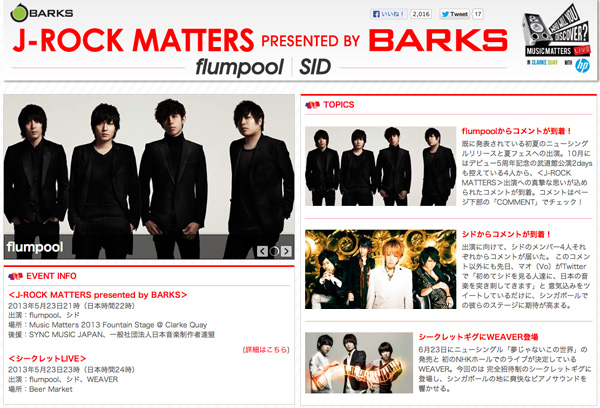 <J-ROCK MATTERS presented by BARKS>は、5月23日21時(現地時間)より、シンガポールのクラーク・キーにて開催される日本のショーケースライブ。当日はflumpoolとシドが1万5000人を動員するMusic Matters 2013 Fountain Stageに登場する。