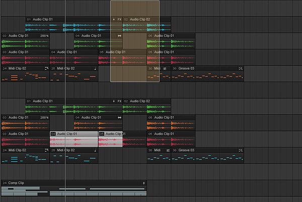 ▲一目で製作中のトラックの状態が確認できるクリップ・ビューと、画面配置を記憶させてタブ切り替え可能なMuiltDock。