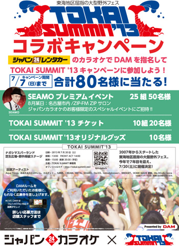 東海地区屈指の大型野外フェス<TOKAI SUMMIT ’13>とジャパンカラオケがコラボ、ジャパンレンタカーのカラオケでDAMを指名すると、抽選でSEAMOプレミアムイベントへの招待や、TOKAI SUMMIT ’13>のチケットなどがもらえるキャンペーンがスタートする。