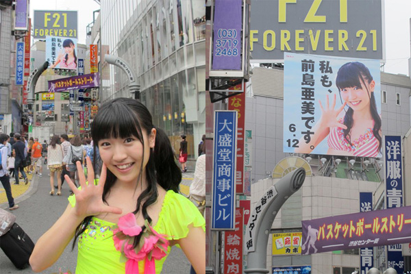 「あー、あみた。」とわかる人にはなんてことないビルボードだが、知らないからすると「?」なことだろう。この「前島亜美」とは、SUPER☆GiRLSの、最年少でセンターで一番頼れる15歳、高校1年生のメンバー・前島亜美。愛称は“あみた”。特技は、かわいい顔からは想像できない極真空手だ。ちなみにティーン向けファッション誌『ピチレモン』の専属モデルとしても活躍しているほか、ソロとしても、多数のバラエティーやTVドラマ等に出演している。