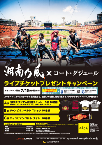 コート・ダジュールのケータイ会員に登録し、毎週届くメルマガから応募するというもので、湘南乃風ライブチケットやツアーグッズが合計30名分用意されている。もちろんコート・ダジュールのケータイ会員登録は無料、お気軽にご参加を。