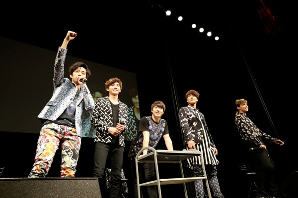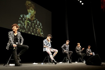 MCの古家氏がメンバーを一人ずつ呼び込むと、会場後方の扉から客席の花道を通って入場するという、いきなりのサプライズ演出。メンバーはお客さんとハイタッチをしながらステージに登場する。日本のファンの前に姿を見せるのは、3月のファンミーティング以来ということで、まずはその間のメンバーの過ごし方からトークがスタートした。