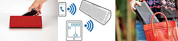▲使用イメージ。対応するNFC搭載のスマートフォンのBluetoothデバイスと、ワンタッチでペアリングや接続の操作が可能(写真左)。上位モデルAirwave HDはマルチポイント接続にも対応(中)。充電式で外出先でも利用可能(右)。