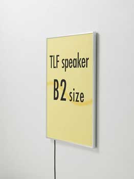 今回登場のTLFスピーカー「TLF-SP1-B2X1」は、店舗内での広告・販促用ポスターの約半数を占めると言われるB2サイズのTLFスピーカー。発売中のA0サイズ・B1サイズに加え、より省スペースな場所への設置や幅広い用途での使用が可能になっている。2013年4月より発売を開始したTLFアンプモジュール「TLF-AM2」と組み合わせることで、店頭でのサウンドサイネージを手軽に実現することができる。