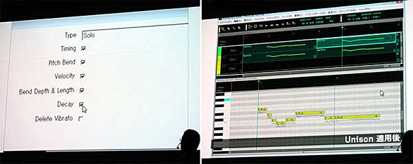 機能面で注目したいのが、簡単にグループの曲を作ることができる新しいJob Pluginの追加だ。Job Pluginは、たとえば「入力した音符を全部一括してスタッカートにしたい」という決まったルールに従ってシーケンスに編集を加える機能。今回ZOLA PROJECTには「ZOLA Unison」というプラグインが追加されている。これはコーラスやユニゾンパートを作るのに効果的なもので、発音タイミングや音程のパラメータにばらつきを与えてくれる。Solo/Unison/Chorusの3タイプが用意され、同じフレーズを複数人に歌わせる場合にそれぞれ違った表情が簡単に付けられるようになっている。ZOLA専用ではなく、ほかのライブラリでの利用が可能なのもうれしいところだ。