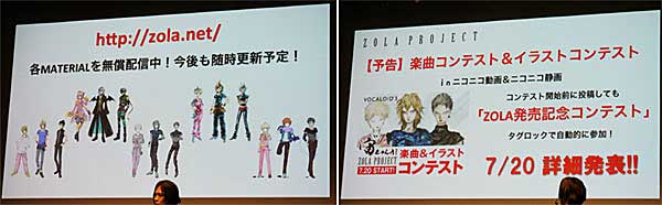 また、初心者を含むクリエイターの支援策として、VOICE MATERIALとILLUSTRATION MATERIALが無償配信されることもあわせて紹介。VOICE MATERIALはZOLAの3人のセリフを各129種、計387ボイスを提供するもの。ILLUSTRATION MATERIALとしては、パッケージを手がけた天野喜孝氏のイラストのほか、4人の絵師によるイラストが提供される。さらに7月20日より楽曲コンテスト&イラストコンテスト「ZOLA発売記念コンテスト」がニコニコ動画&ニコニコ静画で開催されることも予告された(詳細は7月20日発表)。