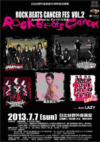 LOUDNESSのドラマー“樋口宗孝”基金主催による小児がん患者支援・疾患啓発・研究支援のためのロック・チャリティ・イベントの第二弾<Rock Beats Cancer FES Vol.2 supported by チューリッヒ生命>が、2013年7月7日に日比谷野外大音楽堂で行なわれる。