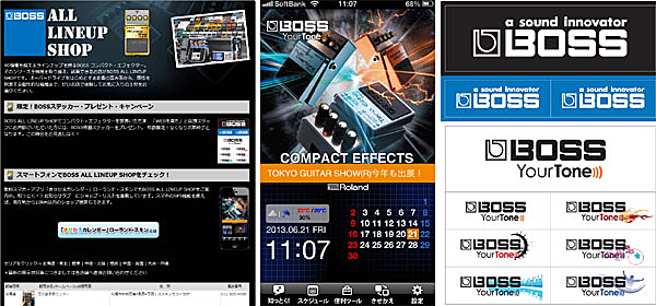 ▲展開店は、BOSS ALL LINEUP SHOP PC ホームページ(左)、iOS/Androidアプリの「きせかえカレンダー」ローランド・スキン(中)でチェックできる。写真右はキャンペーンのロゴ・ステッカー。