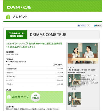 課題曲をDAM★とも動画・録音して応募すると、DREAMS COME TRUE非売品グッズを抽選で10名様にプレゼント!