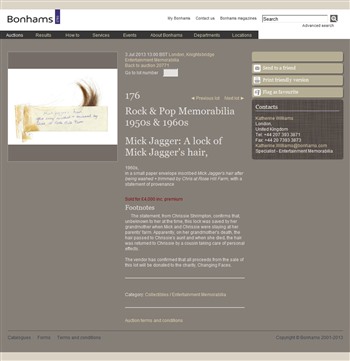 最近、キース・リチャーズの髪の毛もオークションに出品されたが、こちらの落札価格は900ポンド(約13万5,000円)。ミックのものは4倍以上の値がついた。