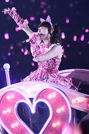 ネコミミを装着し、ピンクの仔ヒョウに変身したゆかりんは、ハートマークのトロッコでアリーナを周り、「My wish My love」では空飛ぶゴンドラで宙を舞う。ここで、久しぶりに魔法のステッキが登場し、“アレ”が行われた。もはや説明は不要!ゆかりんの「めろ~ん」の魔法で16,000人がいっきにメロメロになる姿は圧巻だ。