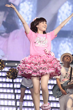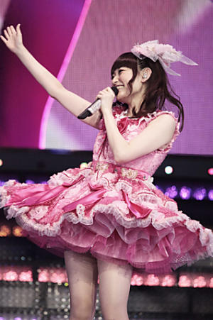 アコースティックで披露された「つぼみのままで」、「miss you」。ここからカップリング曲やキャラクターソングなどが続く。「アンドロメダまで1hour」で勢いよく飛び出したゆかりんだが、ここでちょっとハプニング。下から飛び出してジャンプする時に転んでしまったようだ。「いつでも完璧じゃつまらないじゃない」とハプニングも可愛くおどけてみせる。