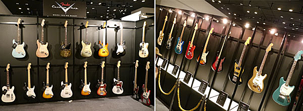 ▲Fender Custom Shopも多数展示。春畑道哉、ken、INORAN、CharなどFender Custom Shopの国内アーティストのシグネイチャーモデルが並ぶスペース(写真右)は、カメラで撮影する人が絶えない人気の展示。