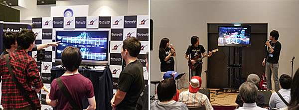 ▲本物のギターを使ったゲーム「ロックスミス」が人気を集めたユービーアイソフト。誰もが知ってる名曲を多数収録、ゲームでギターが上達できる。ミニステージのデモも多くの来場者を集めた。
