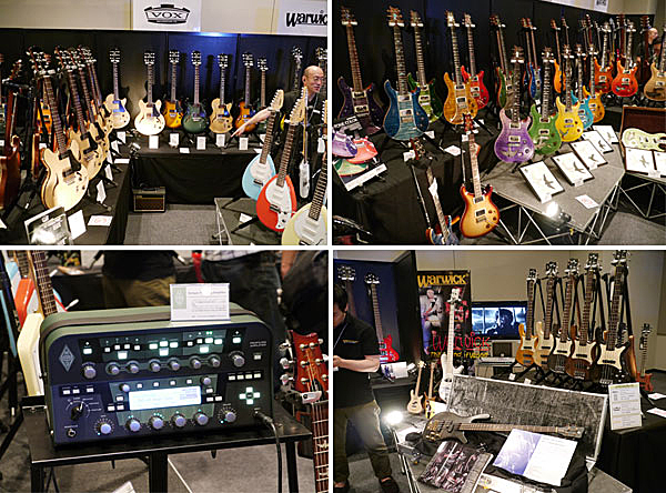 ▲コルグは、スピーカー&リズムマシン内蔵のAPACHEをはじめとしたVOXギター(左上)、PRSのギター(右上)、Kemper Profiling Amplifier(左下)、Warwickのベース(右下)など多数展示。ONE OK ROCKのRyota使用モデルWarwick STREAMER STAGE1 CLASSIC 4は写真撮影する人が多数。コルグのチューナーや各ブランドのグッズの販売も人気。