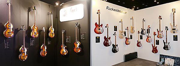 ▲山野楽器によるHofner、Rickenbackerの展示はカメラを構える来場者多し。エレクトリックゾーンでは珍しく販売も試奏もない展示のみのコーナー。