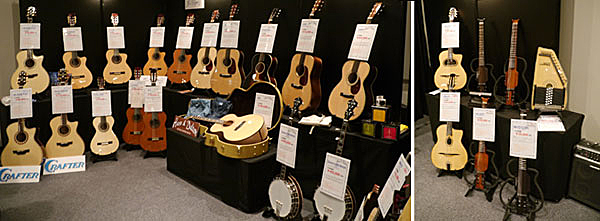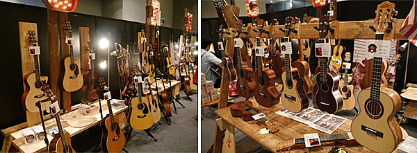 ▲C. F. Matin Guitarのブースでは数多くのアコースティック・ギターに加え、ウクレレも多数用意。アコギボディ内のブレーシング構造がわかる展示なども。