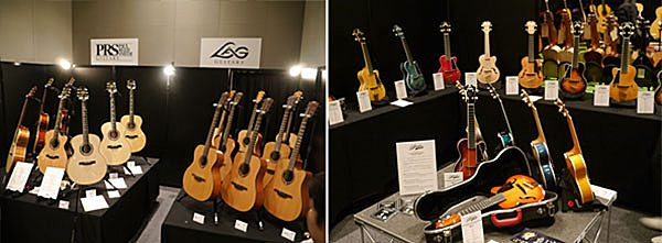 ▲コルグはPRS、LAG Guitarsのアコースティック・ギター(写真左)、VOXのエレクトリックウクレレ、Warwickのアコースティックベースを展示。フルアコギターで知られるD’Angelicoのハイエンドウクレレも多数(写真右)。レフティモデルのほか、フロロカーボンのウクレレ弦も。
