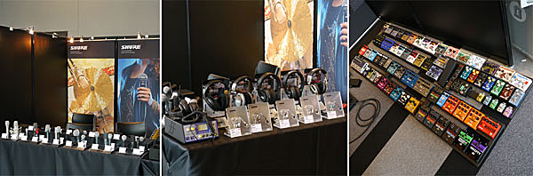 ▲ホール外にも各種ブースが設置。写真はロビーに設けられたオールアクセスのブース。カナル型イヤフォンの新フラッグシップSE846はじめとしたShureのヘッドフォン、マイク、strymon、TECH 21 SansAmpのエフェクターがずらり。