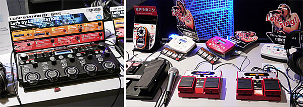 ▲LOOP STATIONの最新モデル、デスクトップタイプのRC-505(写真左)や、ボーカリスト向けエフェクターVE-20、VE-5、ボーカル・トレーナーVT-12も試せる状態で展示。