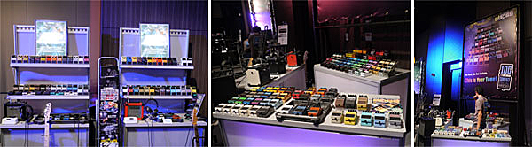 ▲BOSSコンパクト・エフェクターがこれでもかと並ぶ一角。ギター、アンプが用意され自由に試奏が可能。