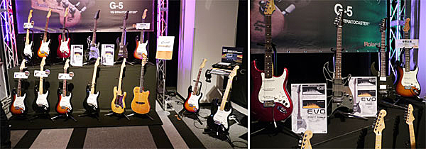 ▲ローランドのV-Guitar G-5やギター・シンセGR-55と並び、イケベ楽器のEVO(イーボ)、島村楽器のCoolZ(クールジー、7月下旬発売)といったGKピックアップ搭載ギターも。