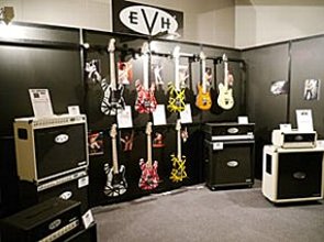 ▲EVHのブースにはアーティストの写真とともにギターのStriped SeriesやWolfgang、アンプの5150IIIのヘッド、キャビネットなど各モデルが展示。