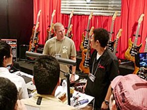 ▲フェンダー・マスタービルダーのデニス・ガルスカによるギター製作デモンストレーションは大きな人垣ができる人気。