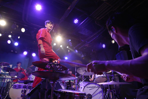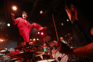 ここでアルバム『10 Drummers vs EARTH』のリード曲「RESCUE」のフィーチャリング・ボーカル、近藤智洋(GHEEE / The Everything Breaks)がステージに迎えられた。赤のツナギを着ていない、ボーカリストが登場したことで、ステージの風景が一瞬にして変わった。近藤のマイクスタンドを使ったパフォーマンスや次第に絶叫へと変わっていく歌声に、突き刺さるようなドラムの爆音はさらにパワーアップ。ドラムとのバトル・セッションはもちろん、野口徹平&平田博信の激しく弾きながらの暴れっぷりも凄まじかった!会場中のテンションを上げた一曲入魂の3分半は、嵐のごとく瞬く間に過ぎ去った。
