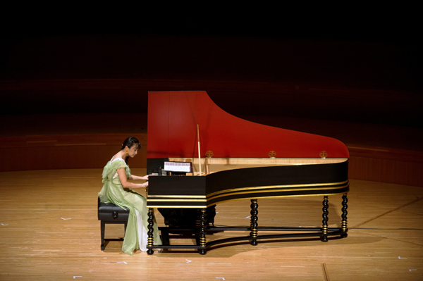 最古の鍵盤楽器は、かのネロ皇帝さえも弾いたらしいという水オルガン。さすがにここまでは遡れないが、その後貴族文化とともに発展したチェンバロからコンサートは開始された。多方面で活躍中の水永牧子がバード、ラモーらの繊細な音色を紡ぎ出した。続いて懐かしいピアノ曲コーナーともいうべき名曲コーナーで、宮谷理香によるモーツァルトの「トルコ行進曲」、山本貴志によるシューマンの「トロイメライ」など。両者ともショパンコンクールの入賞者。以後、着実に歩みを続けている二人である。