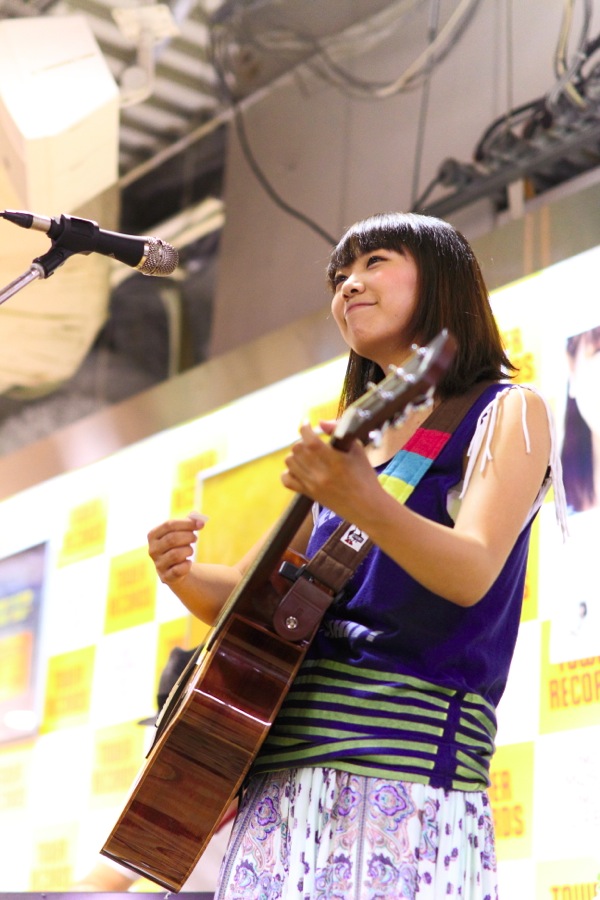 イベントのスタート。山崎あおいは、ファンやタワレコでの買い物客など約300人の観客を目にしてチラリと嬉しそうな顔を見せるも、愛器であるヤマハのアコースティック・ギター、Aシリーズ「AC3M」を手にすると、途端にステージに集中。そして挨拶代わりに1stシングル「Just Friend」を披露する。