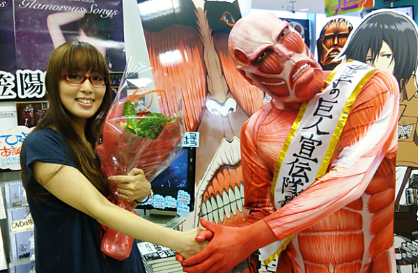 7月17日のアルバム発売日に都内の販売店への店頭挨拶を行っていた日笠は、タワーレコード新宿店での挨拶で思わぬゲストに遭遇。同じく7月17日にBlu-Ray、DVD第1巻を発売したアニメ「進撃の巨人」に登場する超大型巨人に扮した「巨人くん」がサプライズで日笠を待ち構えていた。こちらのビジュアル的なインパクトはまさに超大型、子供が遭遇したら泣きそうな作り込みの精度はさすがと言わざるを得ない。