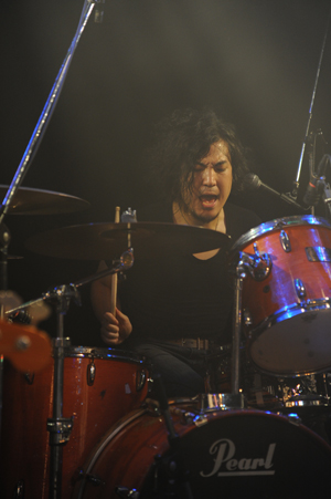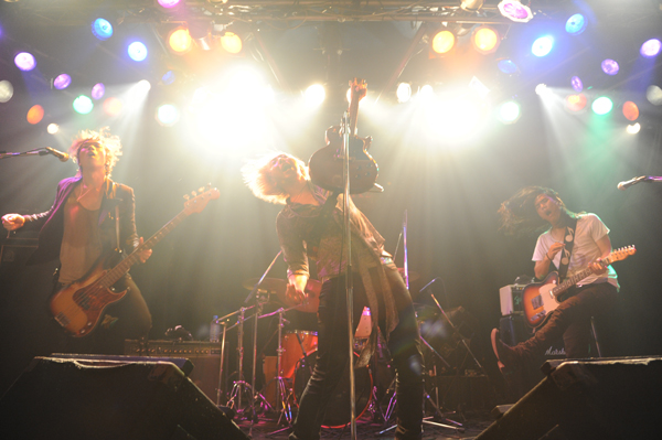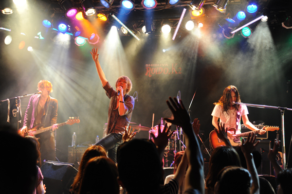 オープニングはTakiのヴォーカルとギターだけで始まり、バンドサウンドへとシフトしていくメロディックでスケール感のある「Let me Go」。続いて、Takiがマイクのみで歌って煽り、Juker(G)とLyuon(B)がステージのギリギリまで出てきてダイナミックなパフォーマンスで挑発するファンクチューン「Addiction」を披露。「楽しもうぜ」と言わんばかりにフロアーの空気をひっぱっていく。至近距離のライヴハウスで演奏しているのに、デカいホールに立っているバンドを見ているような錯覚に陥るのはなぜだろう。