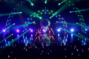 この日公式グッズとして会場で販売していたスイカモチーフのグッズを身にまとい、開演を待ちわびる観客たち。オープニングの音楽が流れ、まずはダンスコーナーがスタートとなった。5月から行っていた<9nine全国百聞<一見TOUR 2013>でも、ファンの間で非常に人気の高かったコーナーだが、ツアーの時とはまた違った音楽とダンスでより進化したクールな9nineの登場に、観客は一気にライブモードに突入する。その流れで「少女トラベラー」「SHINING☆STAR」といった定番のクールで激しい曲を繰り広げる。