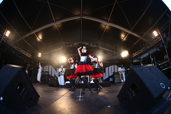 最新シングル曲「メギツネ」からライブはスタート。神バンドによる重厚な生演奏と激しいパフォーマンス、「ソレ!ソレ!」の掛け声に合わせて早くも会場は一体となり、「いいね!」、「Catch me if you can」と続いた。”キツネサイン”を掲げるオーディエンスも次第に広がり、メンバーの掛け声に合わせて会場の熱気はどんどん高まっていく。「ド・キ・ド・キ☆モーニング」、「ヘドバンギャー!!」とMCなしのストイックなステージパフォーマンスが続き、会場にはモッシュや大歓声が涌き起こり会場の盛り上がりも最高潮に達すると、ラストの「イジメ、ダメ、ゼッタイ」のイントロが鳴り始める。すると、オーディエンスの中にできたサークルがどんどんと巨大に広がっていき、YUIMETALとMOAMETALのステージ上での“ウォール・オブ・デス(かけっこ)”に合わせて、大勢が身体をぶつかり合わせモッシュをする、まさに“ウォール・オブ・デス”が一気にスパークした。さらにサビの「イジメ、ダメ!!」に合わせ、会場の後方いっぱいまでにいた観客が揃って「ダメジャンプ」を行うなど、今回が北海道初出演の野外フェスティバルとは思えぬほどの盛り上がりを見せた。最後は「See you!!」と一言だけの挨拶をし、初の北海道でのパフォーマンスを終えた。