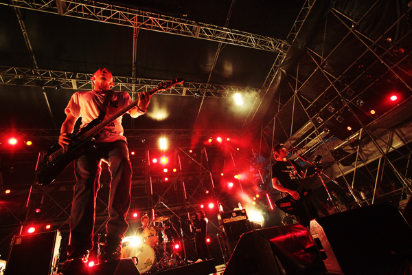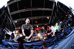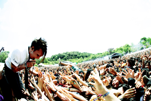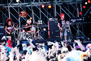 1番手のSiMは鼓膜をビリビリ揺らす、インパクト大なサウンドでオーディエンスに強烈なインパクトを残していった。「Killing Me」や「Amy」で朝から超ヘビーな音の塊をぶつけてくる。メンバーは大きくのけぞってスクリームし、唸り、地面を蹴り上げギターを弾く! その気合の入りよう、理由は“あの丘”。2008年の観客がスカスカだったという「牛若ノ舞台」初出演から5年、待ちに待ったメインステージ「源氏ノ舞台」は溢れるほどのオーディエンスで埋め尽くされていた。その期待に応えるべく、終始気合の入った楽曲陣で楽しませてくれた。